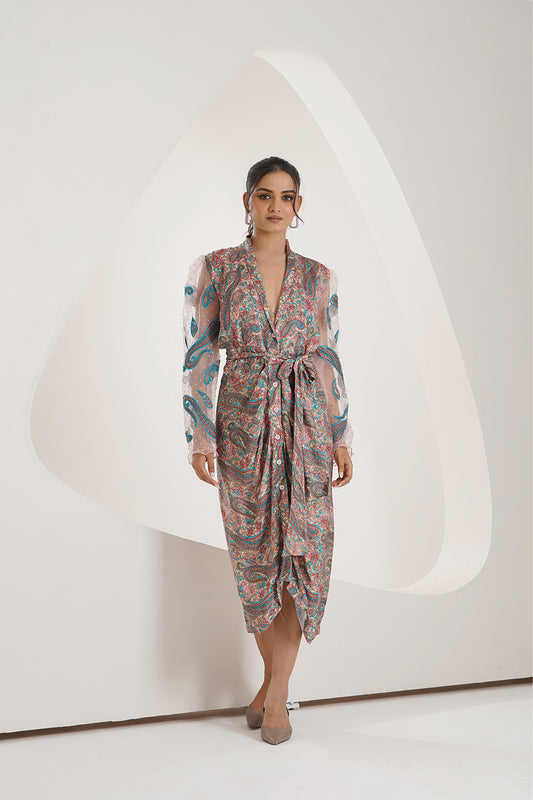 Printed Modaal Satin Drape Dress with Embroidered Patch Work Sleeves on Dot Organza Fabric